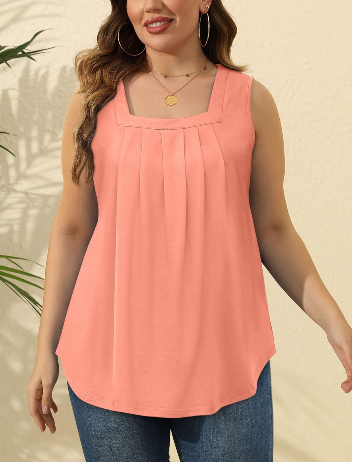 Saloogoe Summer Tank Tops for Women Loose Fit Pleated Square Neck Sleeveless Tops Curved Hem Flowy