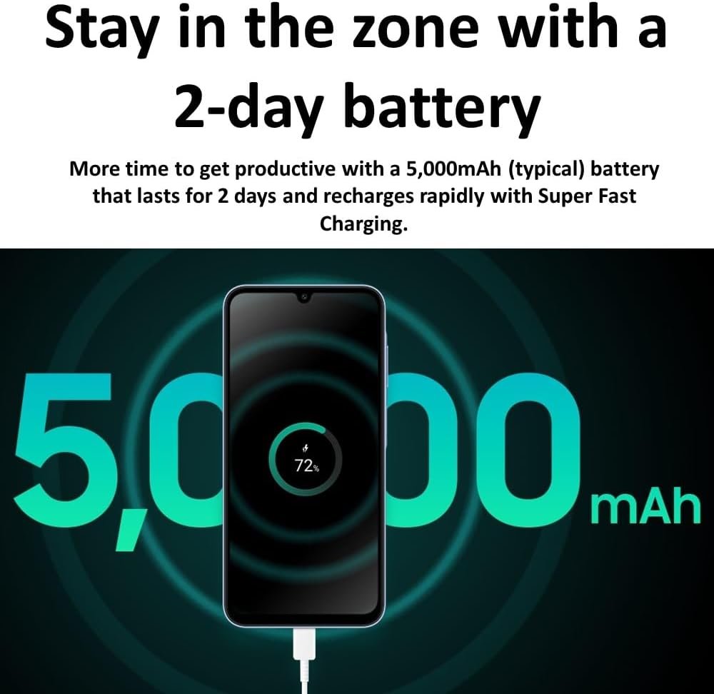 It’s dazzling. The Galaxy A25 5G’s 6.5-inch, Super AMOLED display expresses rich colors and details up to 1,000 nits brightness while enhanced with Vision Booster for clear outdoor visibility. Plus, the Eye Comfort Shield reduces harmful blue light so that your eyes are cared for day and night. The Galaxy A25 5G sheds unnecessary components and highlights its design essence with its clean camera layout, sleek profile, unique patterns and haze finish. You’re on firm ground. OIS and VDIS stabilize your videos with an astounding 500Hz motion sampling rate to let you easily capture the cinematic feel on-the-go or in rough terrain. Equipped with a 50MP Main camera, your device is ready to capture high-resolution images assisted with OIS. The Galaxy A25 5G captures selfies so crisp and clear with an enhanced 13MP Front camera. More time to get productive with a 5,000mAh (typical) battery that lasts for 2 days and recharges rapidly with Super Fast Charging.