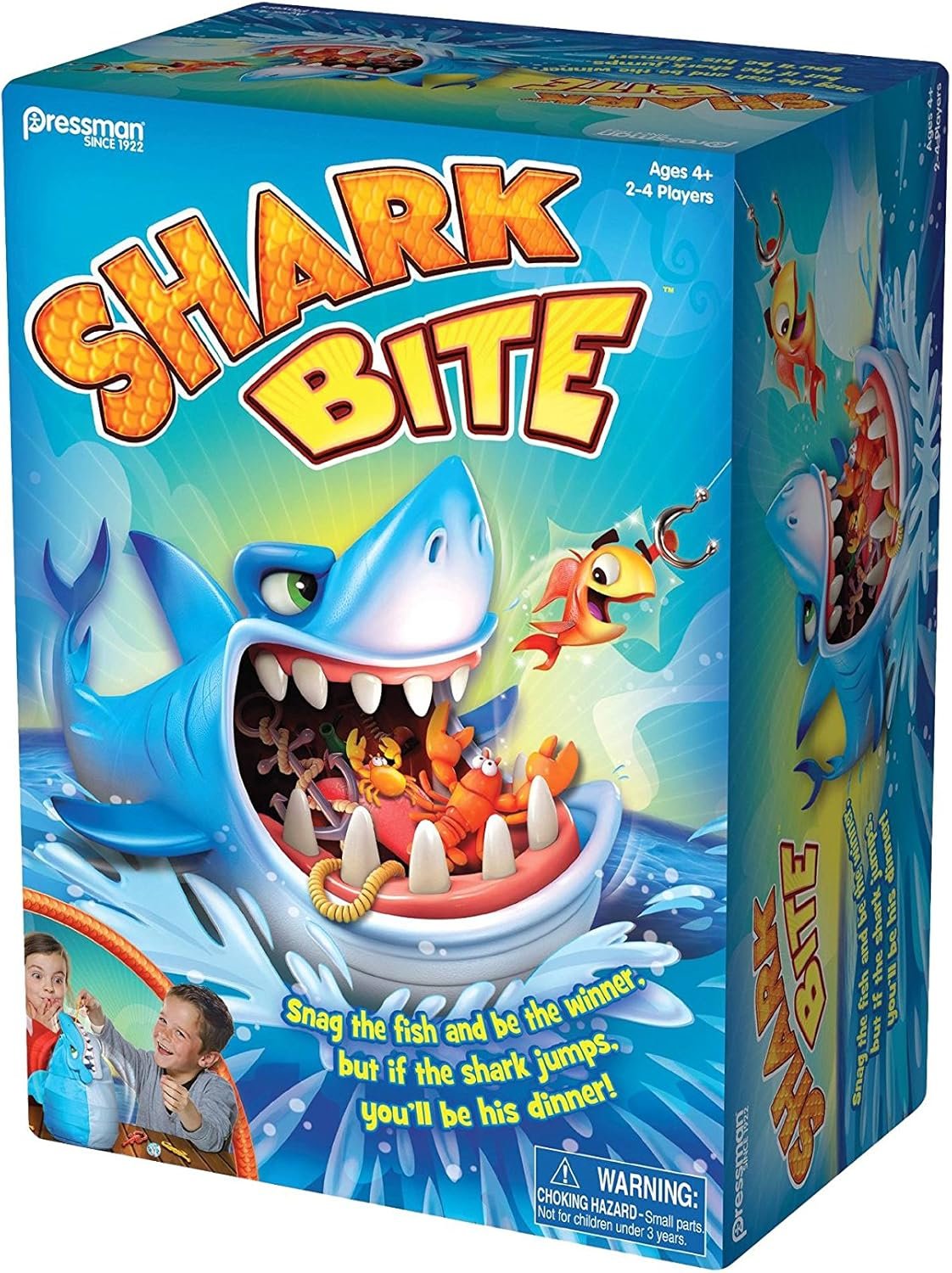 Get ready to have a REEL-y good time when you play Shark Bite! Place the fun and colorful sea creatures into the game unit with a snap, and grab your friends to start playing. Players take turns rolling the die and fishing for the sea creatures using the fishing rods. But watch out – you never know when the shark is going to bite! This battery-free game will have kids hooked at first bite! Made by the o-FISH-cial creators of Let’s Go Fishin’. Includes 1 hungry shark, 12 colorful sea creatures, 2 fishing rods, 1 die, 1 sticker sheet, and complete easy-to-follow instructions. For 2-4 players, ages 4 and up.
