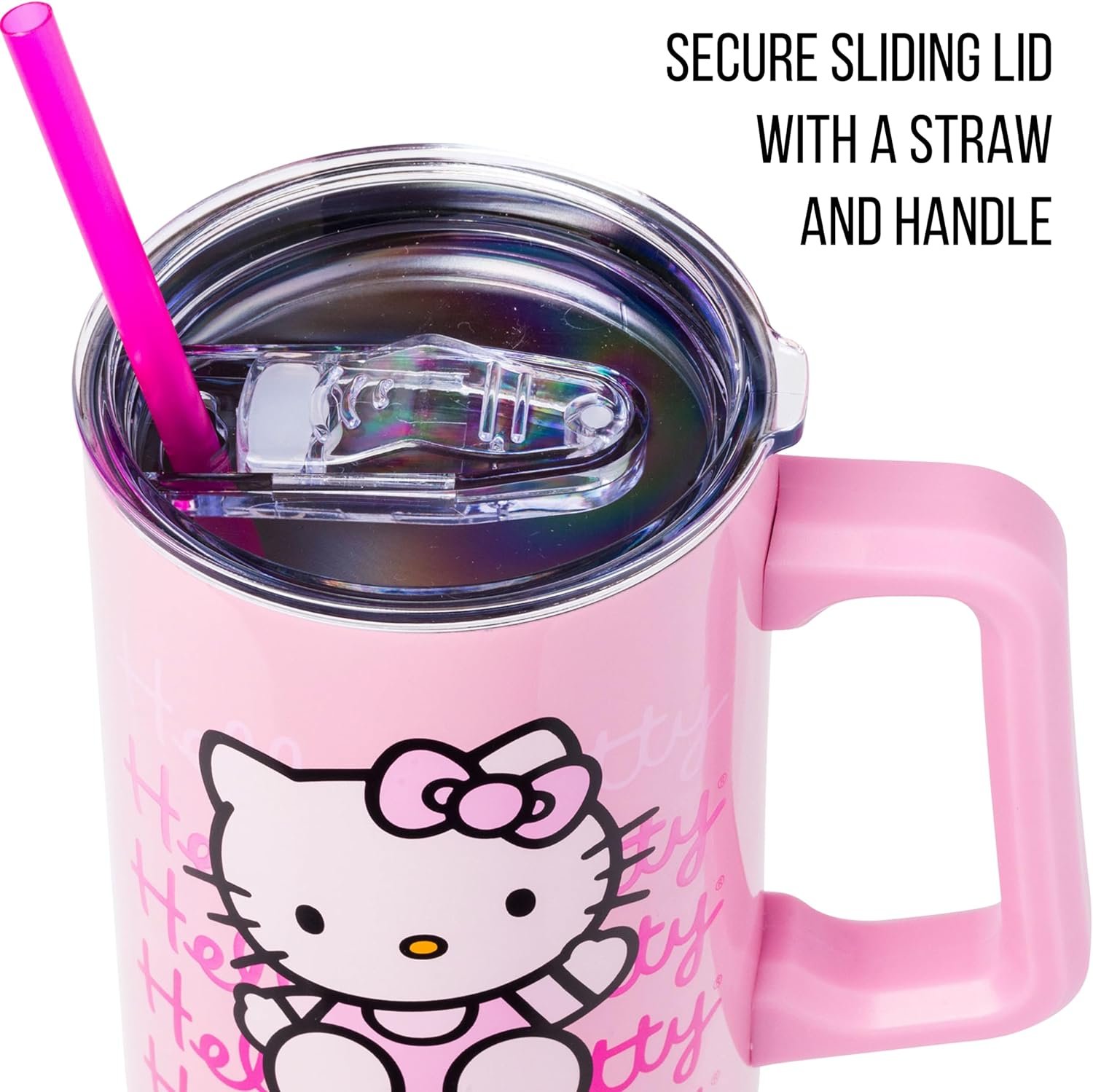 HELLO KITTY: Join Hello Kitty with this double-walled stainless steel travel tumbler that holds 40oz. Designed in a pink background, it features Hello Kitty sitting and waving with the Hello Kitty logo gradient background. It includes a secure sliding lid and straw to stay hydrated on the go. It can even fit in your standard-size cup holder!