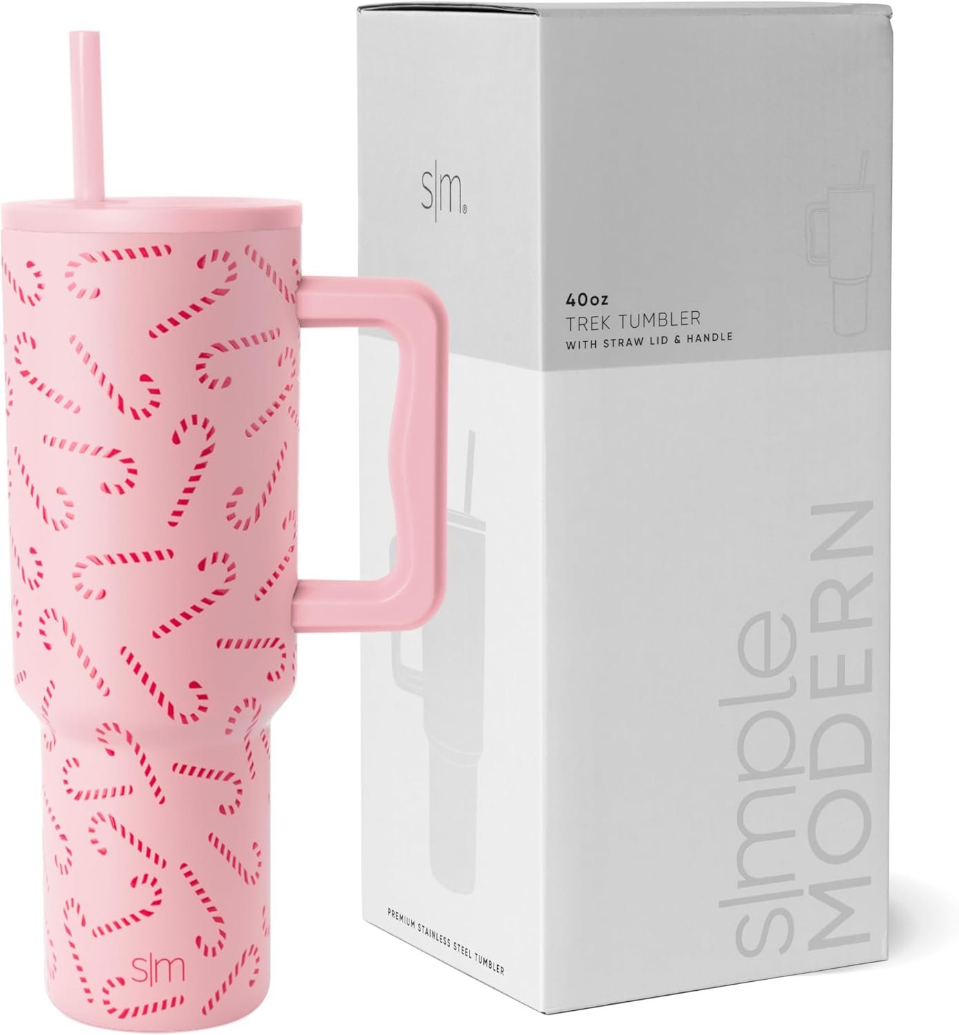 Simple Modern 40 oz Tumbler with Handle and Straw Lid | Insulated Reusable Stainless Steel Water Bottle Travel Mug Cupholder Friendly | Gift for Women Men | Trek Collection | Pink Candy Cane Toss