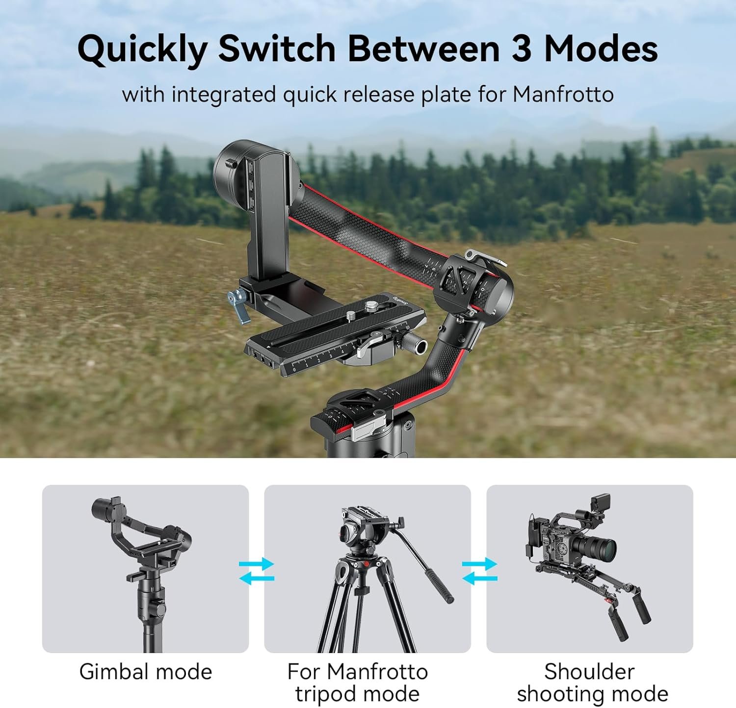 【Switch Quickly】The SmallRig QR Plate 3158 features for Manfrotto standard plate, assisting the camera in quickly switching between the tripod (for Manfrotto), shoulder, gimbal, and other shooting modes.