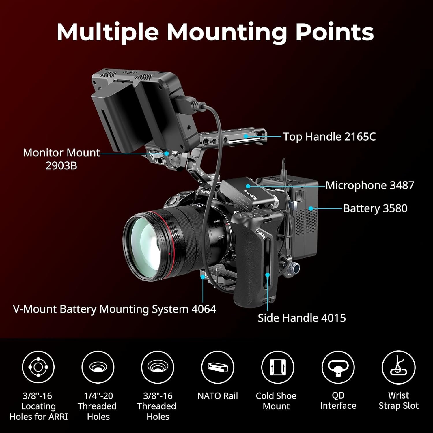 Expansion frame has multiple built-in 1/4″”-20 and 1/4″”-20 positioning holes, can be used with side handles 2093, 4346 and other auxiliary lens movement equipment, can expand magic arms 3874, 3875, monitor bracket 2904B, for MFT base plate 1280, 2458, image transmission support MD43 60 and other accessories; built-inpositioning threaded hole for Arri on the top, which can be expanded to carry the upper hand 3765, quick-release upper hand 4483, and monitor bracket 2903B; built-in cold shoe interface, supporting the expansion of microphones, fill lights and other equipment. built-in wrist strap port, which can be used with wrist straps 3848 and 2456; built-in shoulder strap hole, the lens is facing downward when worn diagonally to protect the lens; built-in QD interface, compatible with QD quick-release shoulder strap 4118; built-in Arca quick release interface at the bottom, which can be directly installed on Arca tripod 4060 & 4353 and for DJI RS 2 / RSC 2 / RS 3 / RS 3 Pro/ RS 4 / RS 4 Pro stabilizer.