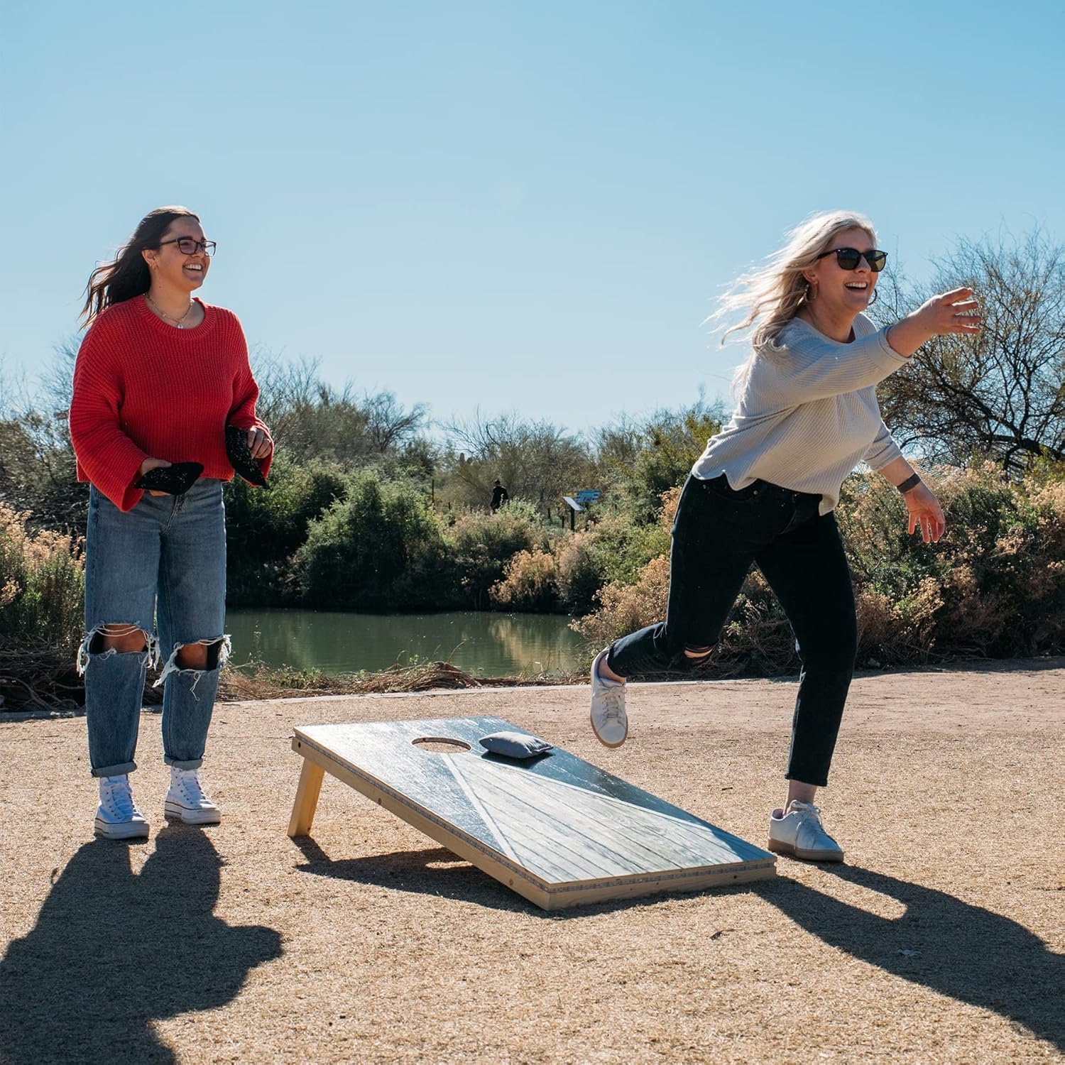 8 BEAN BAGS & CARRYING TOTE INCLUDED – Each Set comes with 8 Regulation Size Cornhole Bags (4 of each color). Bags Measure 6”x6” and are Filled with 15-16 ounces of Whole Kernel Corn. Made with Heavy Duty 12 oz Duck Canvas & Double Stitched for Extra Durability.