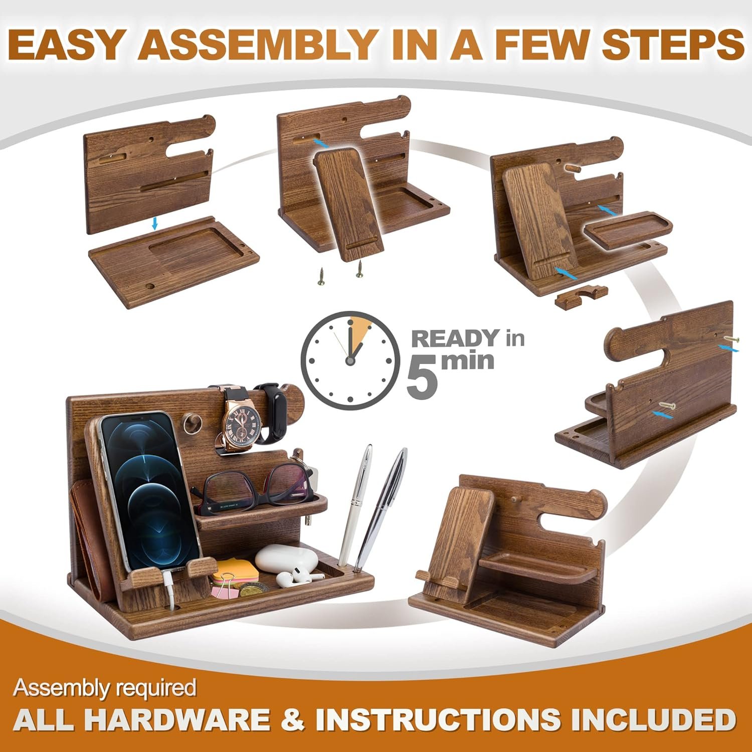 SMART DESIGN: The stand is easy to assemble (assembly manual attached) and сompatible with all kinds of smartphones; The stand also has compartments for wallets, documents, glasses, watches, fitness trackers, bracelets, keys, stationary etc