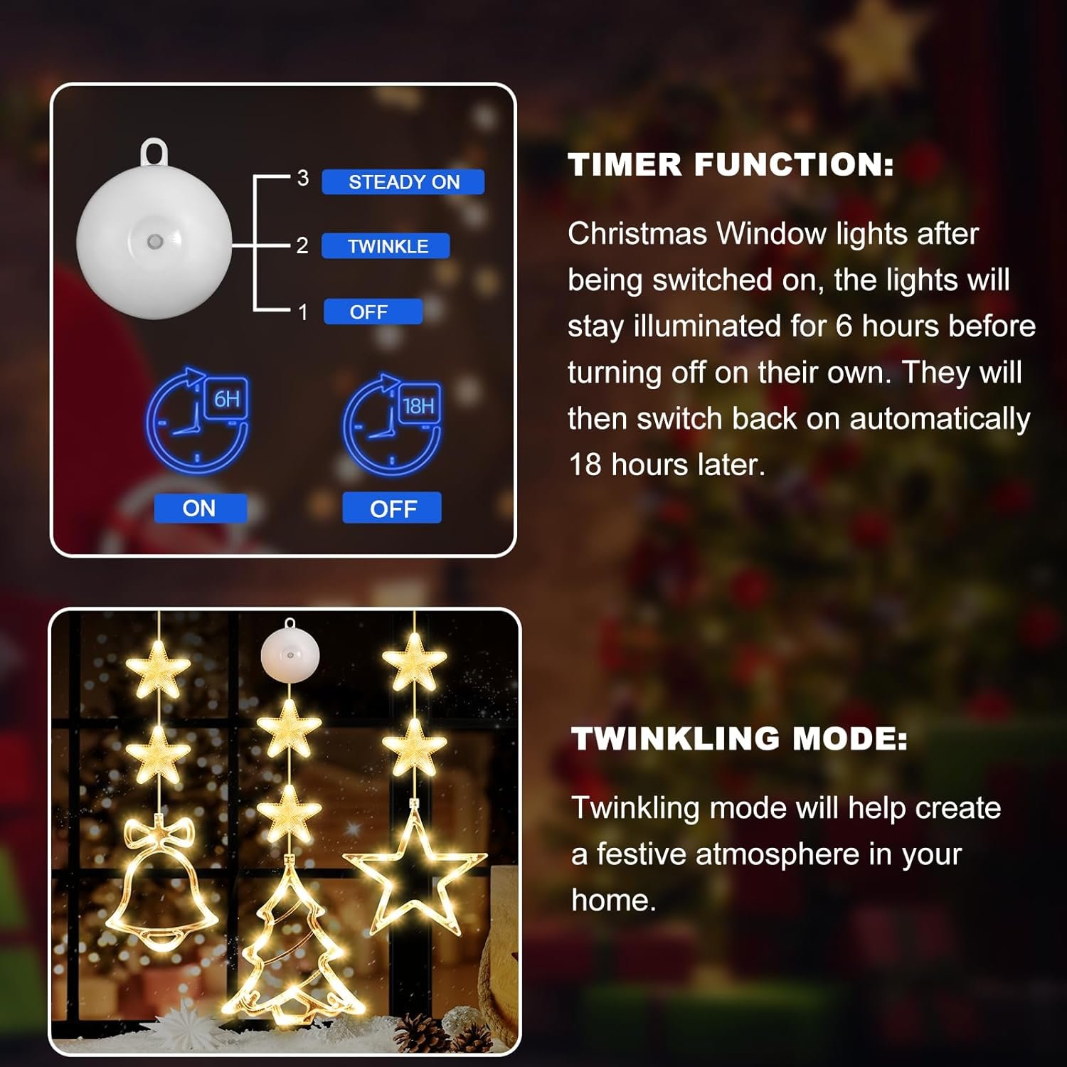 đăEASY TO USEă : the window decoration light comes with a suction cup, which can be easily installed on glass, gates, cabinets, etc., and the height can be adjusted according to the fixed position and press the ON/OFF button on the battery compartment to turn on/off the lights (Lighting Mode: Steady on, Twinkling).make sure that the suction cup is clean before installation, adding appropriate water to increase the adhesion.