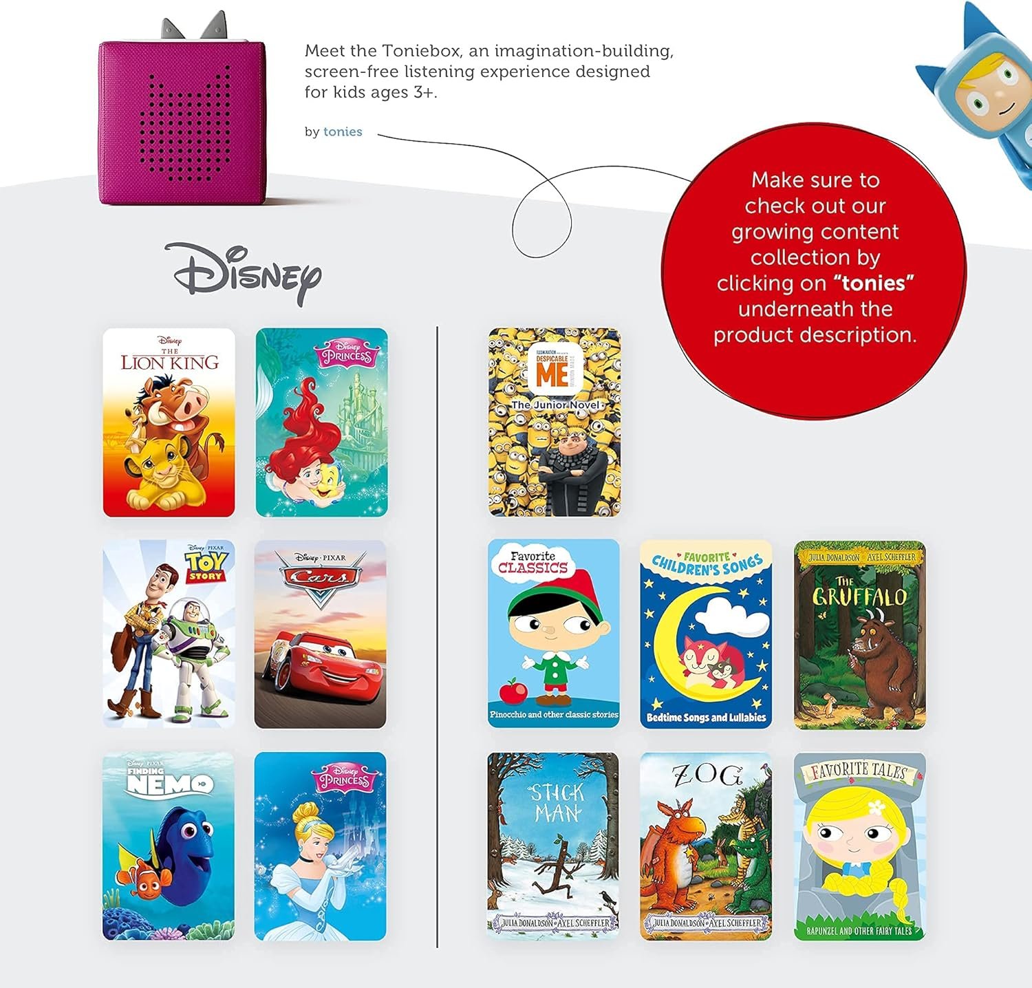 Tonies is designed for the way kids play with intuitive controls that young kids can use independently. Our growing selection of collectable Tonies – from Disney to Sesame Street to PAW Patrol – provides a large library of stories, songs, and educational content for any occasion.