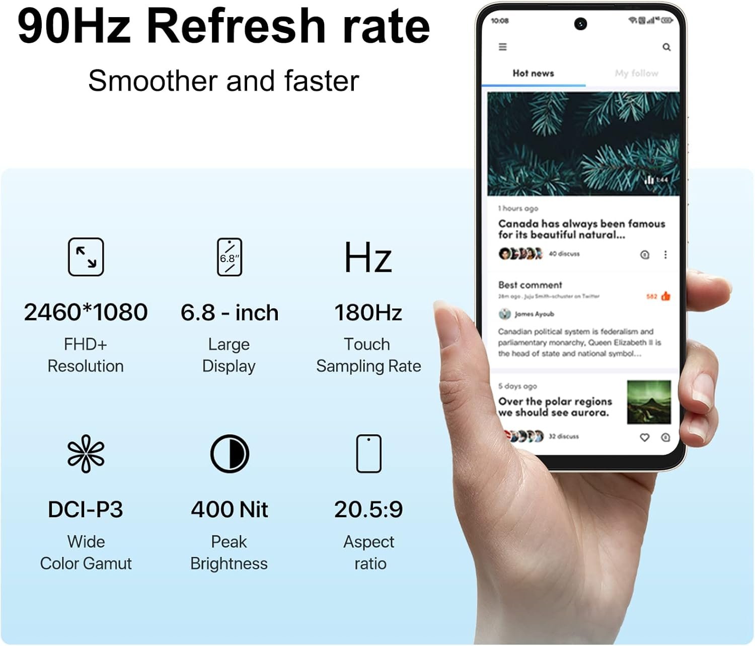 【6.8-inch screen & Ultra-thin body】 A13 PRO MAX 5G smartphone is 8.76mm thick and weighs only 200 grams. It is compact and portable with USB Type-C connectivity, a large 6.8-inch screen, and 2460*1080 HD+ resolution. With FHD+ display with 90Hz refresh rate, the screen looks wider and can be used comfortably. Capacitive multi-touch and AG matte glass finish give you a more comfortable using experience.