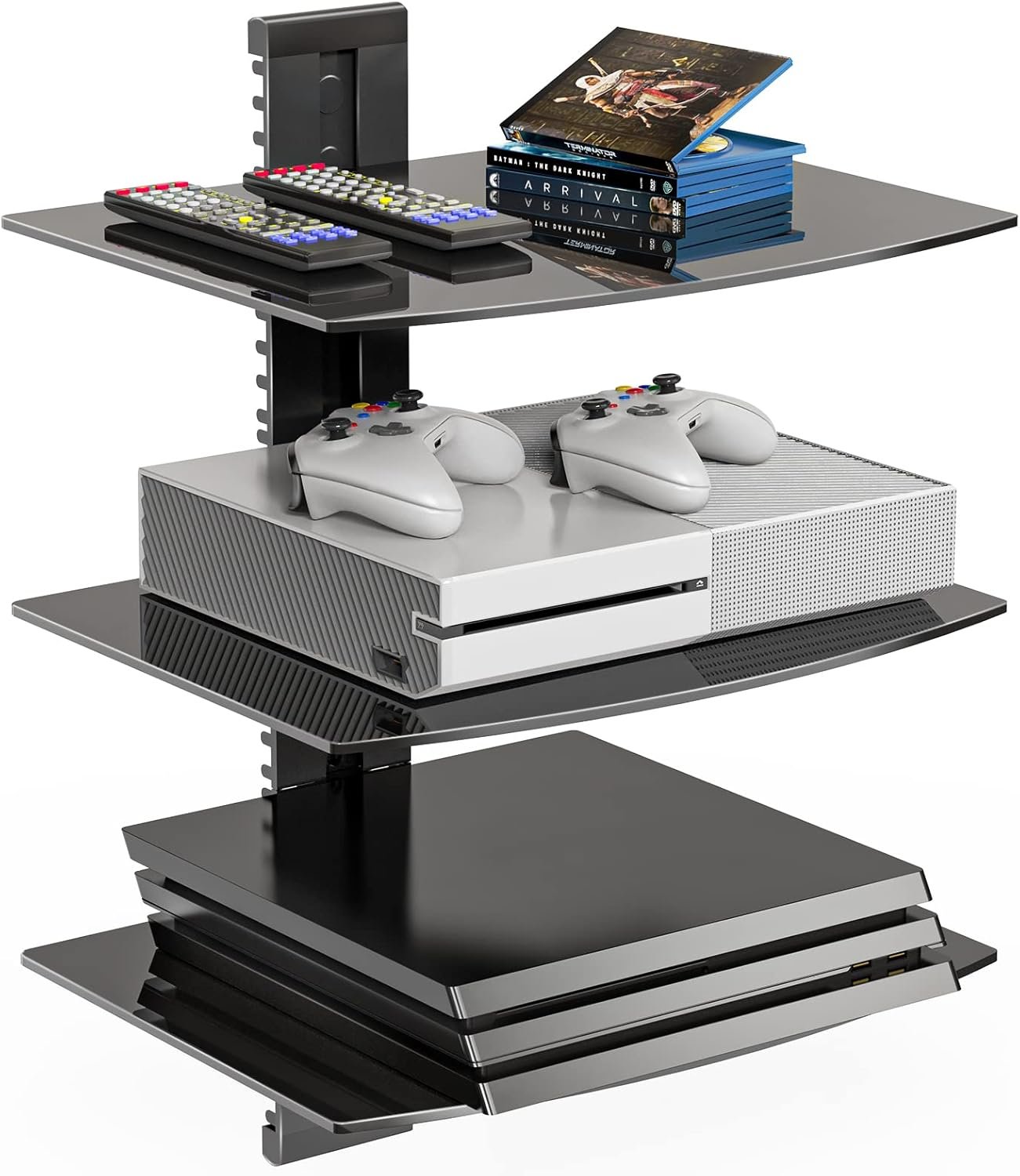 WALI Floating Entertainment Center Shelves, Holds Up to 17.6lbs, TV Shelf with Strengthened Tempered Glasses for DVD Players, Cable Boxes, Games Consoles, TV Accessories (CS303B), 3 Shelf, Black