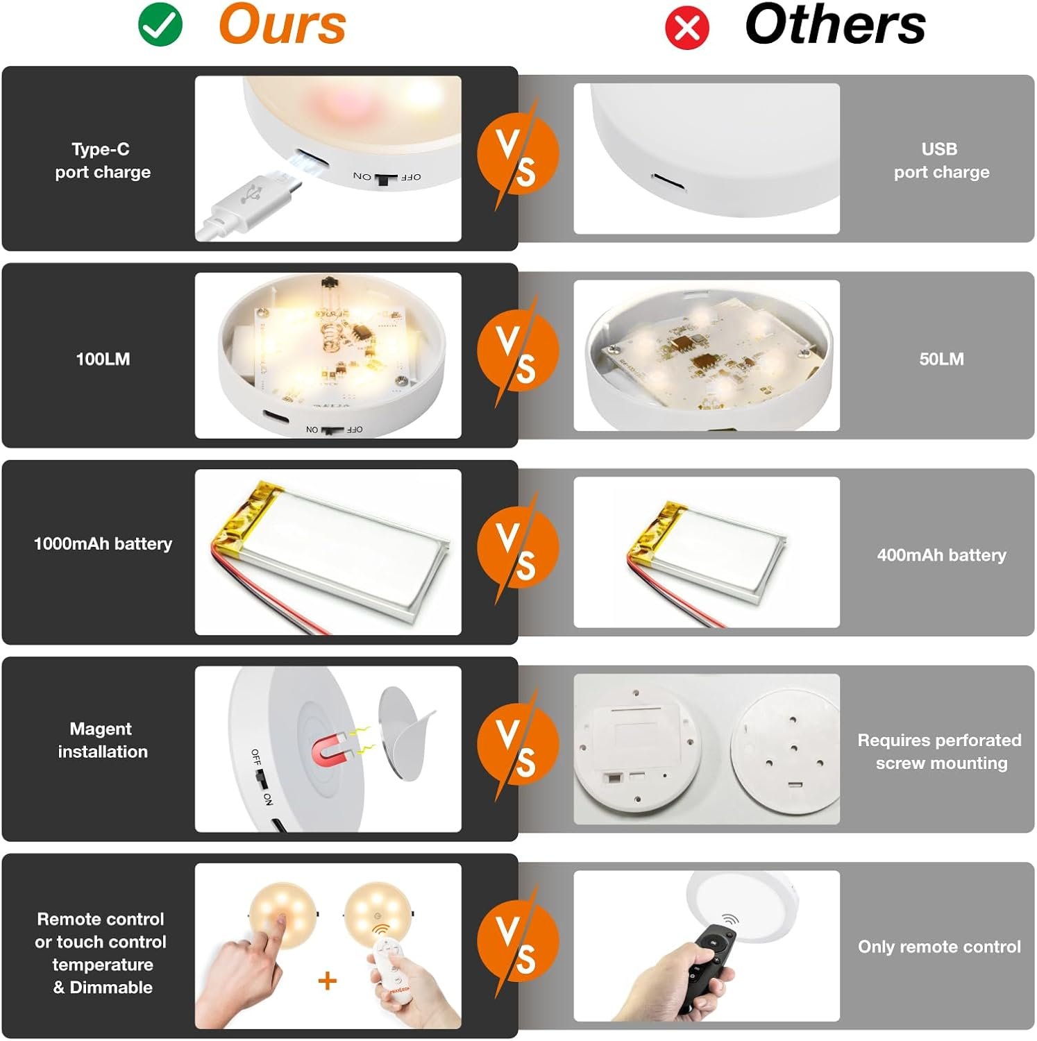 【Best Service Guarantee】We provide 24-month warranty and lifetime technical support, and do our best to make every customer have a good shopping experience. If you encounter any problems during use, please feel free to contact us, we will handle and give you a satisfactory answer within 24 hours. The Package includes 3 LED Puck lights, 1USB charging cable, 4 strong powerful 3M types of glue and 1user manual.