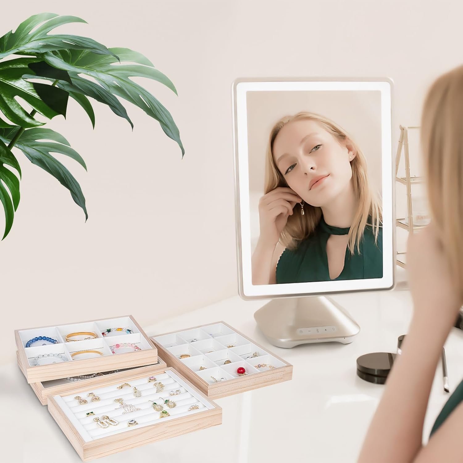 Wooden Stackable Jewelry Organizer Trays 4 Set, Wood Jewelry Storage Holder for Drawer Inserts, Jewellery Display Case Box for Earring Necklace Rings Bracelet w/Removable Dividers ((White)
