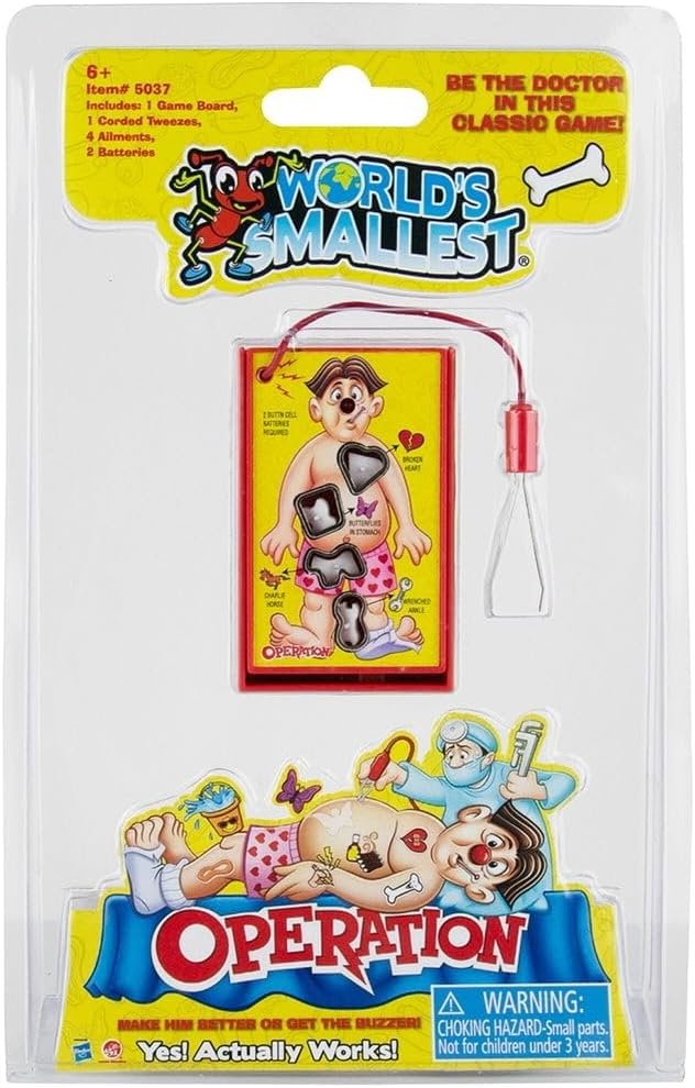 Experience the classic Operation board game like never before with the world’s smallest version! Measuring a tiny 2.75 x 0.625 x 1.75 inches, this miniature game delivers all the same nerve-wracking fun in a compact size that’s perfect for taking on the go. Whether you’re a longtime fan or a first-time player, you’ll love the challenge of using the tiny tweezers to carefully remove Cavity Sam’s funny ailments without setting off the buzzer!